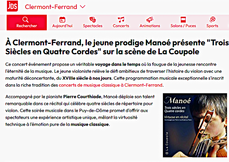Pierre COURTHIADE est un pianiste professionnel reconnu. Il commence l’apprentissage du piano à l’âge de 8 ans. Après un cursus musical complet, il obtient une médaille d’or au Conservatoire National de région de Clermont-Ferrand. Ensuite, il étudie l’accompagnement à Paris avec Christine Rouault Louchard, tout en en travaillant régulièrement, depuis 1989, le répertoire pianistique, avec son maître, Eric Heidsieck. Ses qualités d’accompagnateur et de chambriste lui offrent l’occasion de travailler avec des musiciens membres de grands orchestres comme le Philharmonique de Radio-France, l’Orchestre d’Ile de France, l’Orchestre de Tel Aviv, l’Orchestre de Bordeaux Aquitaine ... Il aime donner des concerts dans de nombreux pays : Tunisie, Maroc, Suisse, Hongrie, Japon, Croatie, Pérou, Norvège, Allemagne, Paraguay ... Il collabore également avec des ensembles dont il est régulièrement partenaire : Chœur Régional d’Auvergne, Centre Lyrique d’Auvergne, Orchestre National d’Auvergne ou Musica Médiante ..... S’intéressant particulièrement à la musique Contemporaine, il joue beaucoup ce répertoire, participe à de nombreuses créations et travaille avec de nombreux compositeurs parmi lesquels Charles Chaynes, François Bernard Mâche, Asbjorn Schaathun, Tish Daija, Daniel Stirn, Stéphane Bozec, Henri Loche, Gilles Raynal, Henri Dutilleux, Daniel Meier, Tapio Tumela, Jean-Marc Jouve, André Serre Milan ...... Il est aussi l’un des 3 membres fondateurs du Festival Musiques Démesurées de Clermont-Ferrand. Il participe également à des spectacles mêlant textes et musiques : « Le voyage d’Hiver », « Mozart intime », « L’histoire du soldat », « Danse Lili danse », « Invitation au voyage », « La Boite à joujoux », « Je est un autre », « Lovecraft » et « Monsieur Satie, compositeur de musique »..... Parallèlement, il s’intéresse au clavecin et au continu Baroque en travaillant avec Jacques Frish ou Marinette Extermann et en se produisant entre autres avec des Ensembles comme Aria ou Da Camera...Depuis 25 ans, il travaille avec le Quatuor des Volcans avec lequel il a donné de nombreux concerts Classiques ainsi qu’avec l’Ensemble Instrumental des Volcans pour des programmes autour d’Ennio Morricone, Astor Piazzola, Nino Rota, la chanteuse Chinoise Yun Li, Le Concert des Sorciers .... Jusqu’à sa retraite prise cette année mais en continuant sa passion, il fut accompagnateur pour les classes instrumentales ainsi que celle de chant au Conservatoire à Rayonnement Régional de Clermont-Ferrand. C’est en cette qualité qu’il accompagnera Manoé le 4 septembre 2019 pour son audition obtenue avec succès qui lui a permis d’intégrer cet établissement dans lequel il termine son cursus avec deux années d’avance. Durant tout ce temps avec régularité Pierre accompagnera ainsi la progression de Manoé jusqu’à réaliser ensemble dans une complicité musicale et partagée des concerts comme au Moulin de Nouara, aux Estivales de Montpeyroux et le 17 janvier prochain 2026 à la Salle de la Coupole à Clermont-Ferrand où vous êtes chaleureusement invités à venir les écouter.